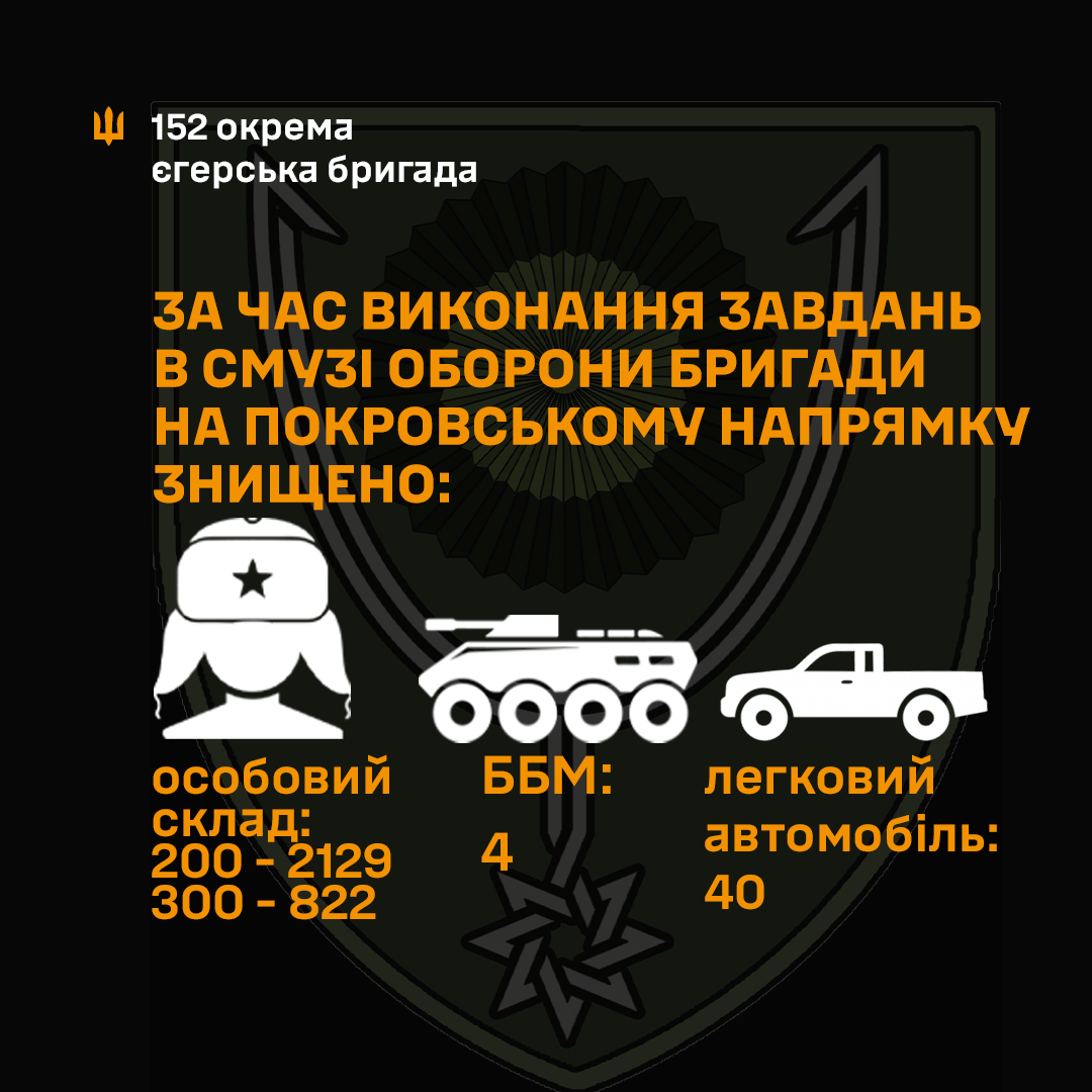 30.06.2025 Особовий склад ворога: 200 — 2129 300 — 822 Техніка: ББМ — 4 Легкові автомобілі — 40 Мотоцикли — 8 БПЛА — 24 Засоби РЕБ — 1 Міномети — 2 152 окрема єгерська бригада Сухопутні війська ЗС України #152оєбр #Сухопутні_війська #ЗСУ #Україна 154Views